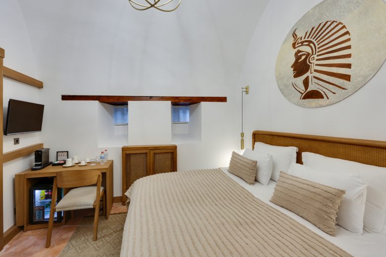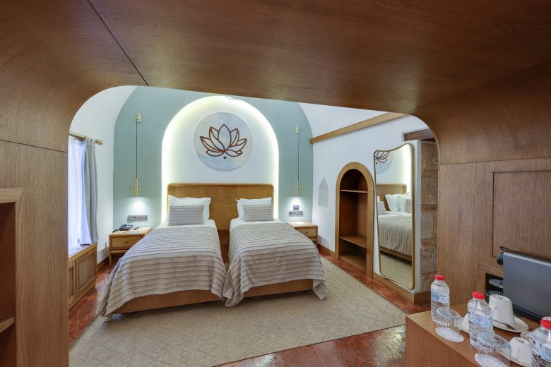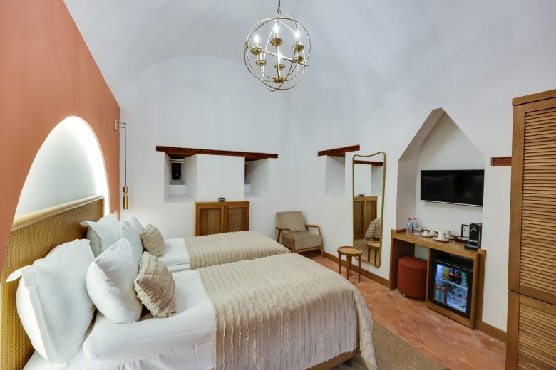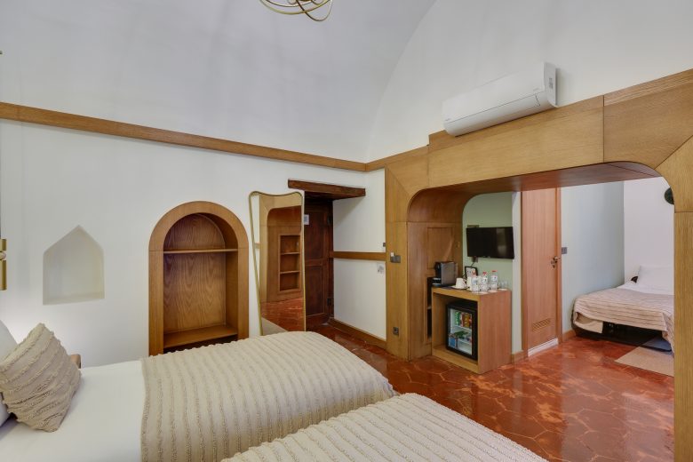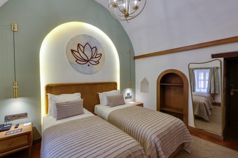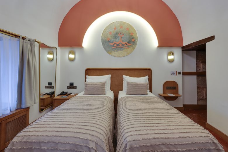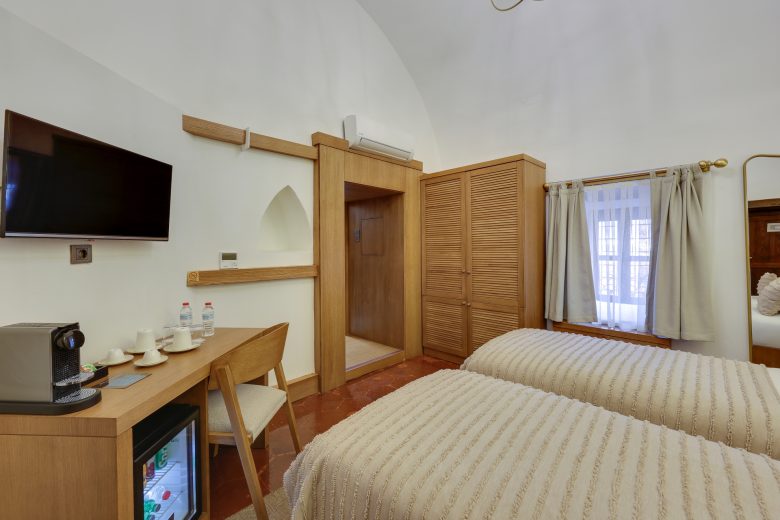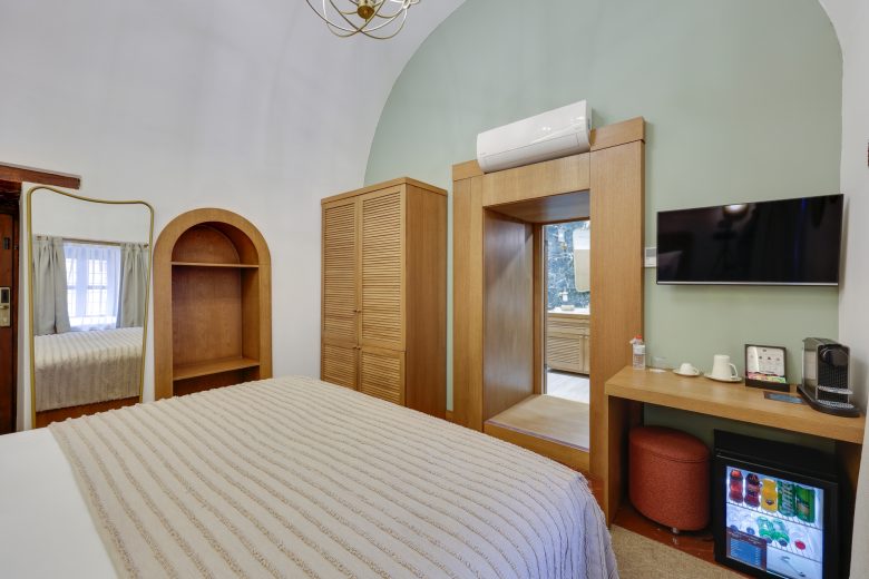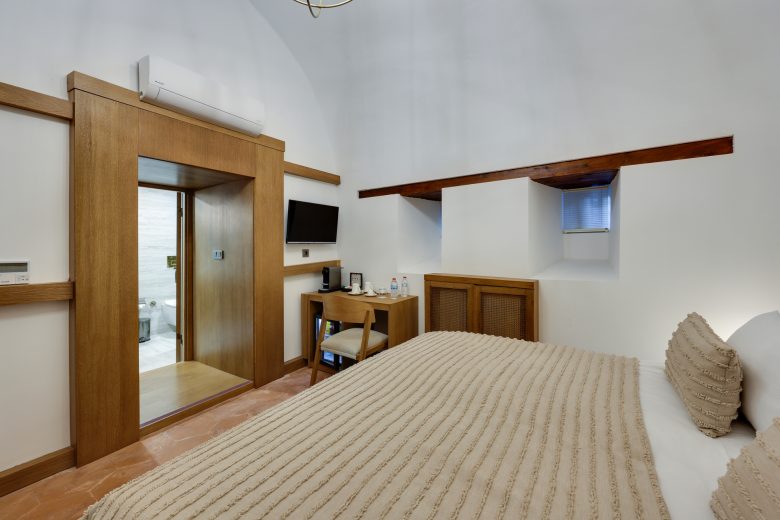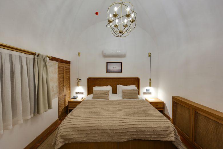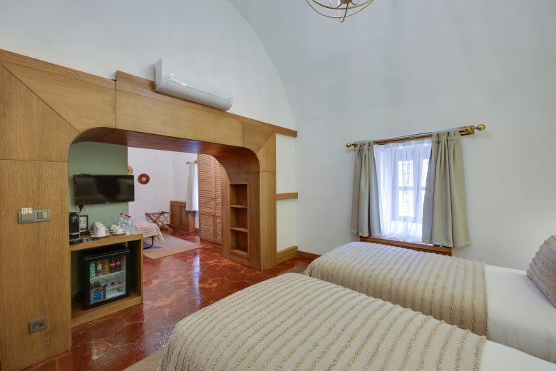 Odamız çift kişilik oda konseptindedir. 15m2’lik oda hacmine ek olarak 6.5m2’lik banyo & tuvalet hacmi bulunmaktadır. Odanın zemini orijinal haliyle korunmuş olup köşeli tuğladan yapılmıştır. …