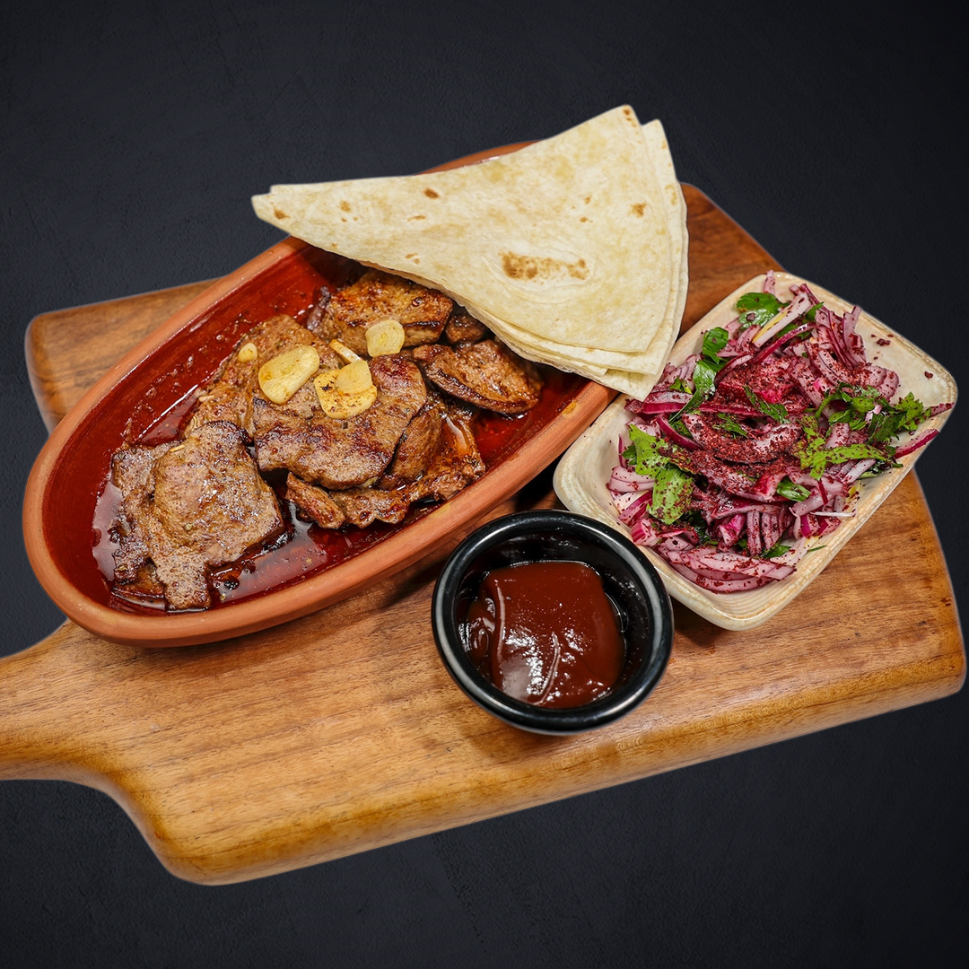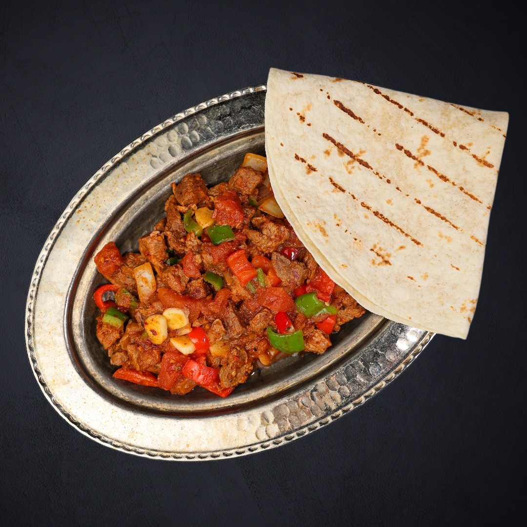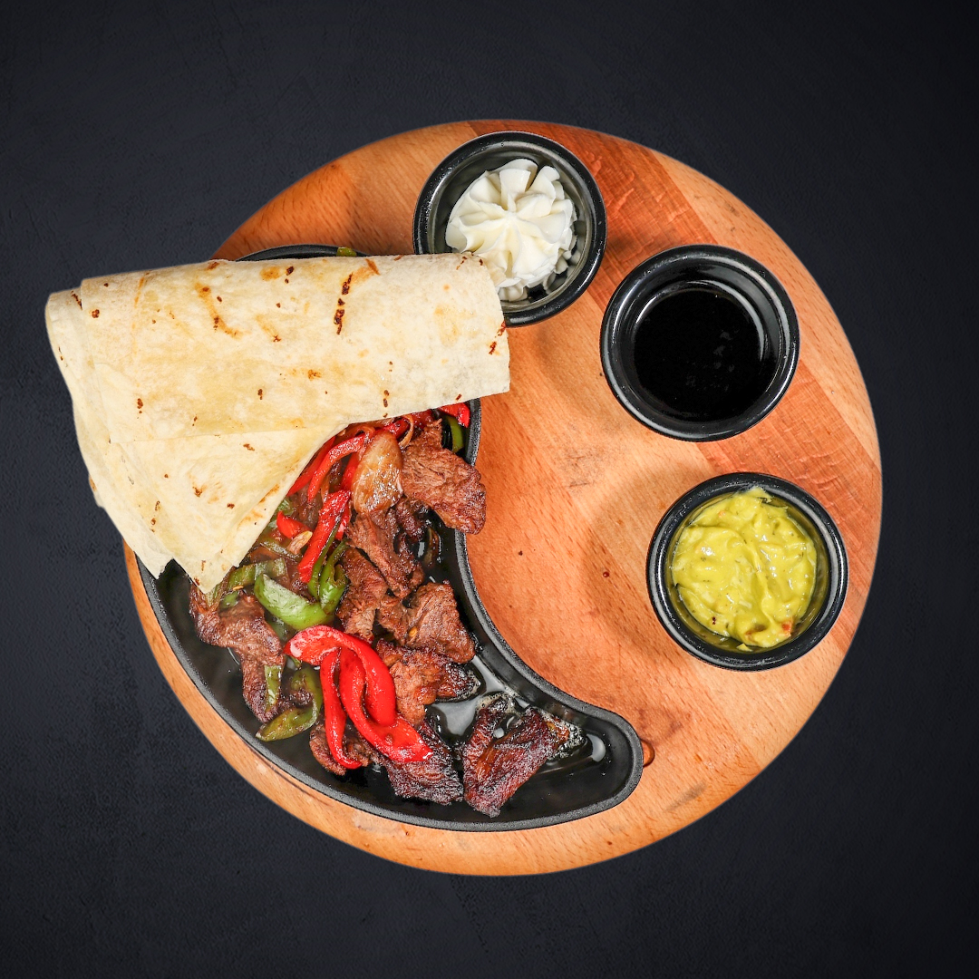 900 ₺SOTELENMİŞ KIRMIZI KAPYA BİBER VE KURU SOĞAN, JULYEN DANA BONFİLE , DOMATES BAHARATLI TORTELLA EKMEK FAJITA SOS İLE SERVİS EDİLİR / SERVED WITH SAUTEED RED PEPPERS AND ONIONS, JULYEN BEEF STEAK, TORTELLA BREAD WITH TOMATOES AND SPICES FAJITA SAUCE