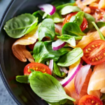 500 ₺RENKLİ ÇERİ DOMATES,TAZE FESLEĞEN,CEVİZ,DOLMALIK FISTIK,ROKA SALATALIK MISIR PESTO SOS İLE / COLORFUL CHERRY TOMATOES, FRESH BASIL, WALNUTS, PISTACHIOS, ARUGAL, CUCUMBER, CORN WITH PESTO SAUCE