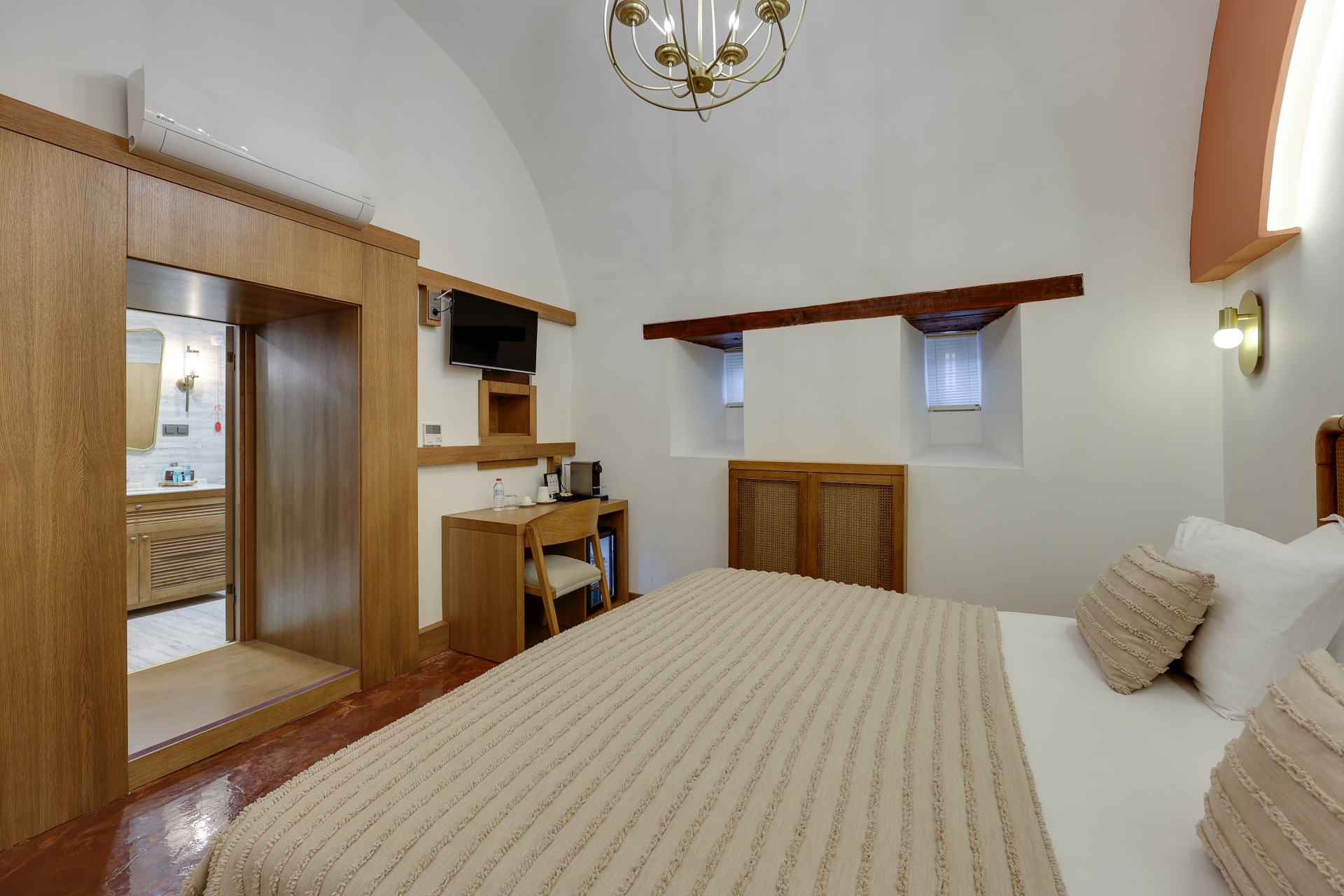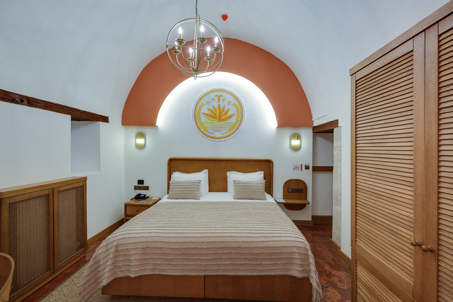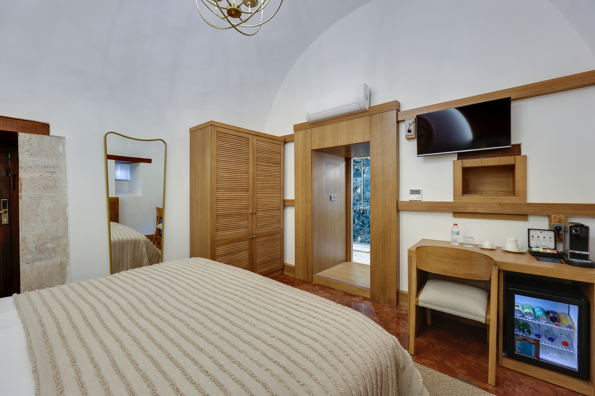 Odamız çift kişilik oda konseptindedir. 15m2’lik oda hacmine ek olarak 6.5m2’lik banyo & tuvalet hacmi bulunmaktadır. Odanın zemini orijinal haliyle korunmuş olup köşeli tuğladan yapılmıştır. Oda tavanı tonoz örtü şeklinde 365 cm yüksekliğinde ferah bir görünüm sunmaktadır. Odada çift kişilik yatak, minibar, su ısıtıcısı fonksiyonlu Nespresso kahve makinesi, emanet kasası, klima, çekyat ve bazı odalarda bavul bölmesi bulunmaktadır. Çift kişilik yatak ihtiyaca göre ayrılarak iki ayrı tek kişilik yatak olarak düzenlenebilmektedir.