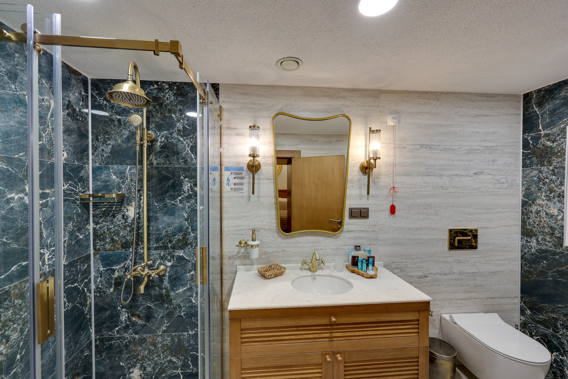 Banyo bölümünde ise tarihi mekan konseptine uygun olarak pirinç malzemeden sıhhi tesisat ve banyo armatürleri seçilmiştir. Banyoda, panjur detaylarına sahip kapılı ve çekmeceli banyo dolabı, rustik ayna ve havlu askısı bulunmaktadır. Tarihi mekan konseptine uygun olarak her türlü banyo aksesuarı kullanıcılara sunulmaktadır. (Banyo tekstili ürünleri ve banyo malzemeleri eklenecektir)