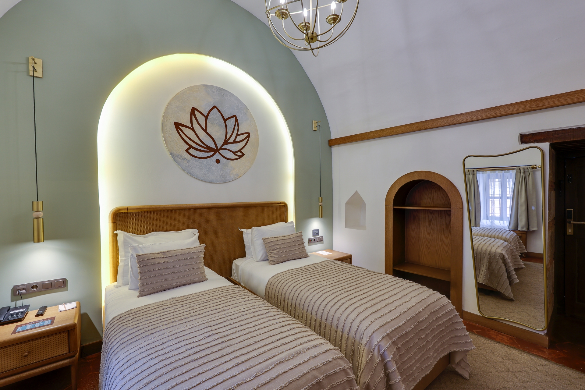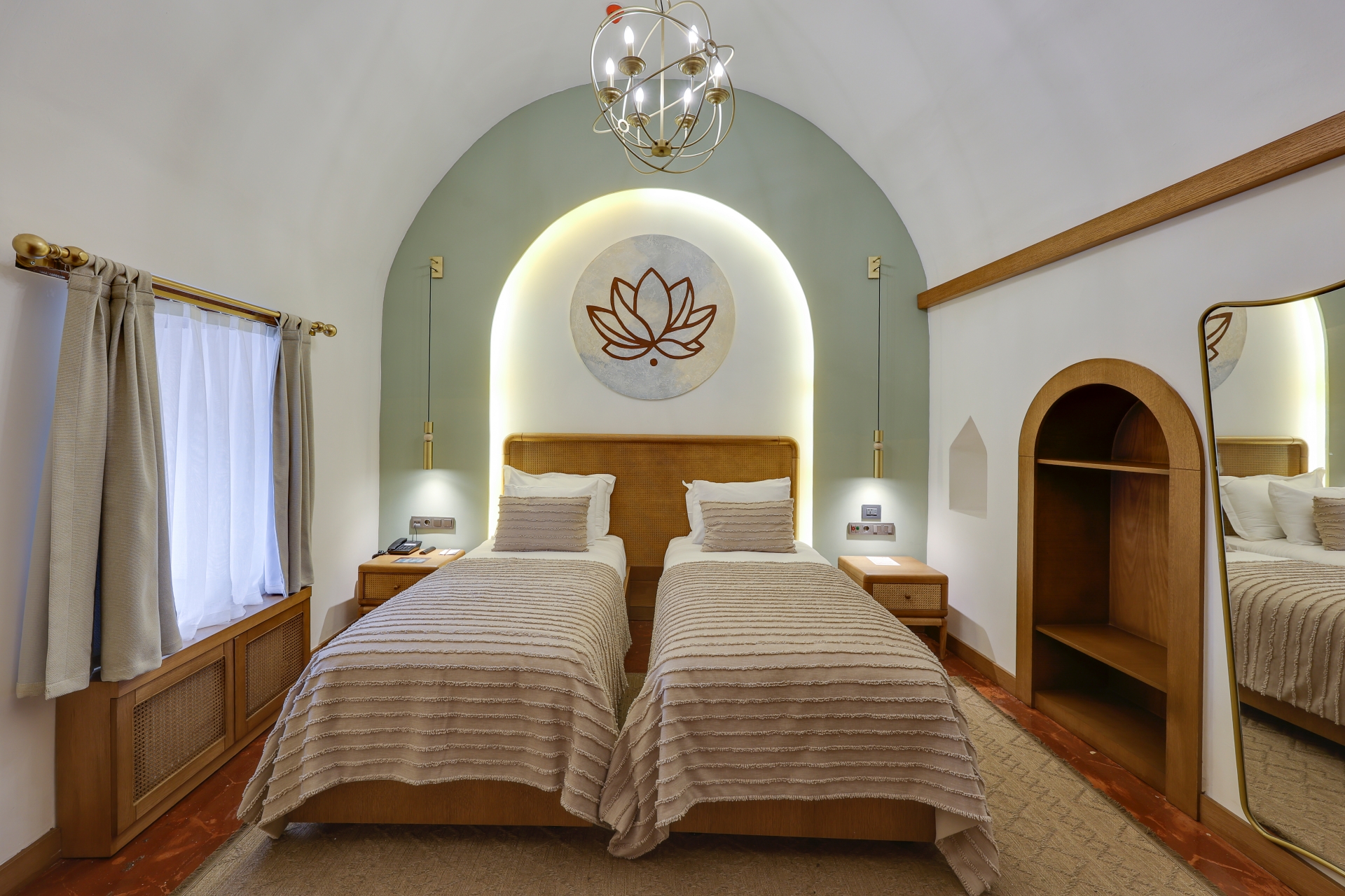 Odada çift kişilik yatak, minibar, su ısıtıcısı fonksiyonlu Nespresso makinesi, emanet kasası, klima, çalışma masası ve koltuk bulunmaktadır. Çift kişilik yatak ihtiyaca göre ayrılarak iki ayrı tek kişilik yatak olarak düzenlenebilir. Ahşap mobilyalar tarihi mekana uygun meşe ve fındık detaylarıyla oluşturulmuştur. Petekler ahşap ve fındık örtü ile gizlenmiştir. Yatak tekstili ürünleri tarihi dokuya uygun birinci sınıf pamuk ve keten kumaşlardan ve organik malzemelerden seçilmiştir.