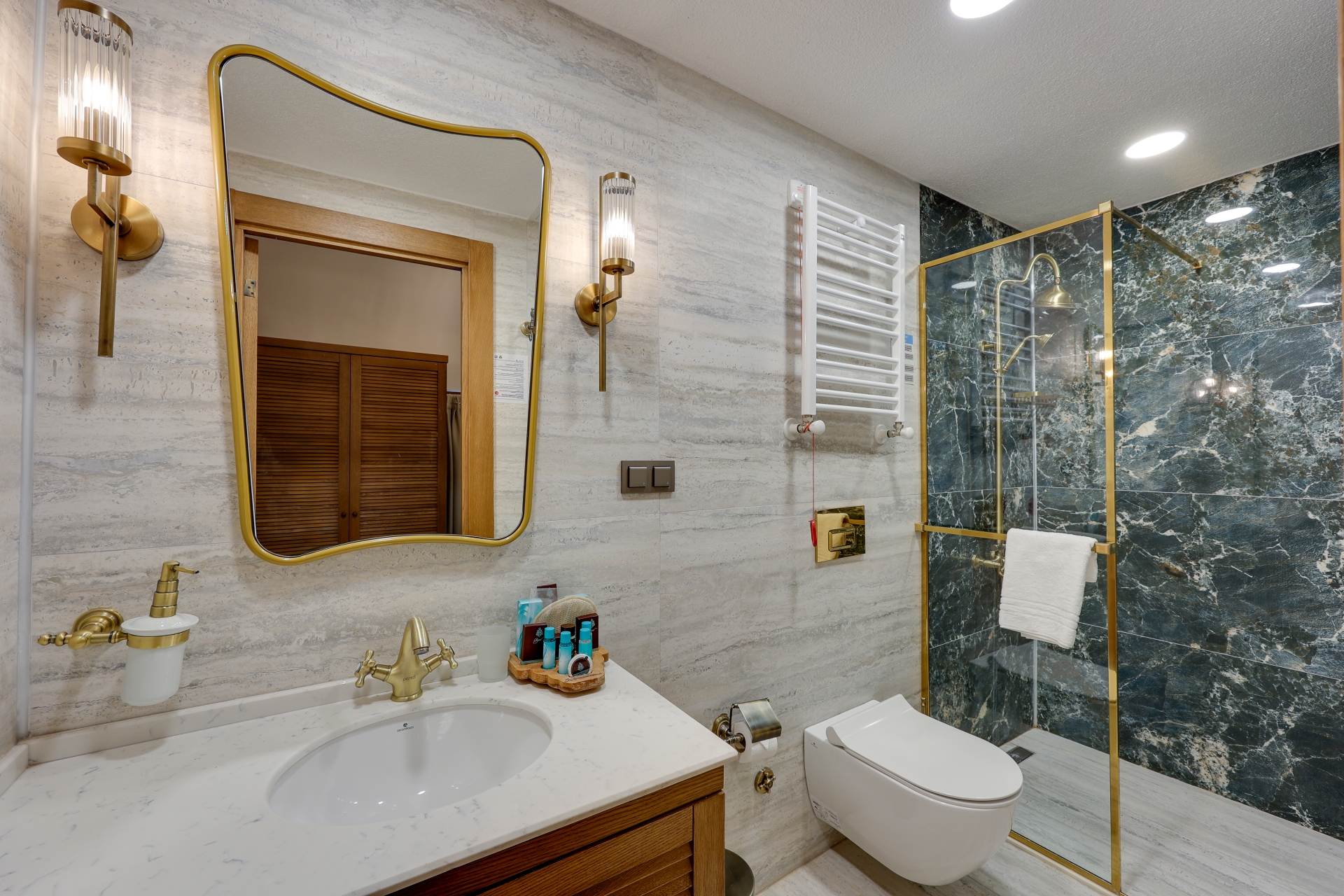 Banyo bölümünde, tarihi mekan konseptine uygun olarak antika pirinç malzemeden sıhhi tesisat ve banyo armatürleri seçilmiştir. Banyoda, kepenk detaylarına sahip kapı ve çekmeceli ahşap banyo dolabı, rustik ayna, tuvalet, duşakabin ve bazı odalarda jakuzi bulunmaktadır. Tarihi mekan konseptine uygun olarak her türlü banyo aksesuarı kullanıcılara sunulmuştur. (Banyo tekstili ürünleri ve buklet malzemeleri eklenecektir)