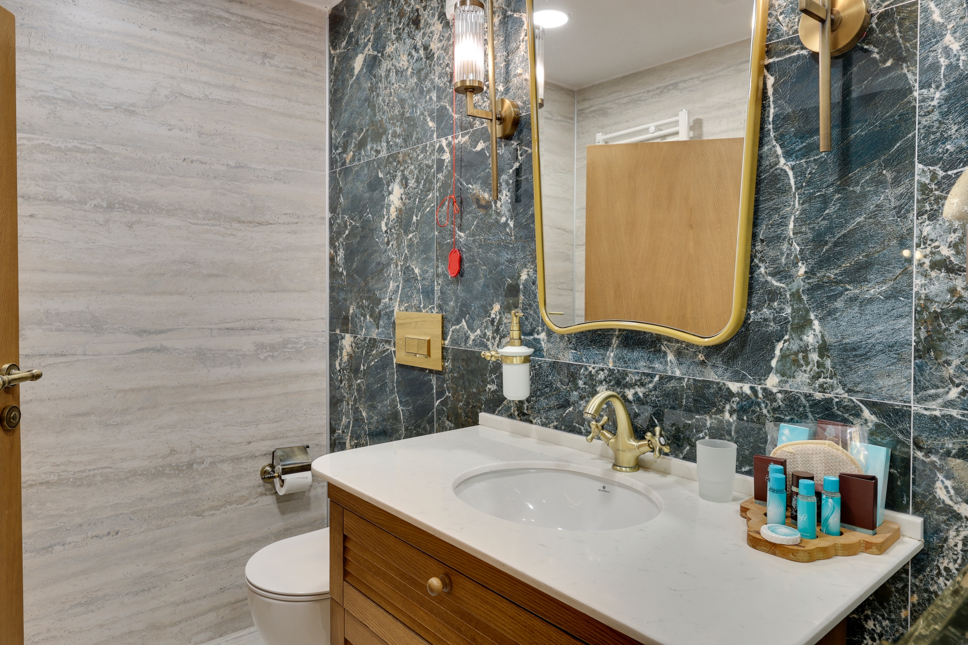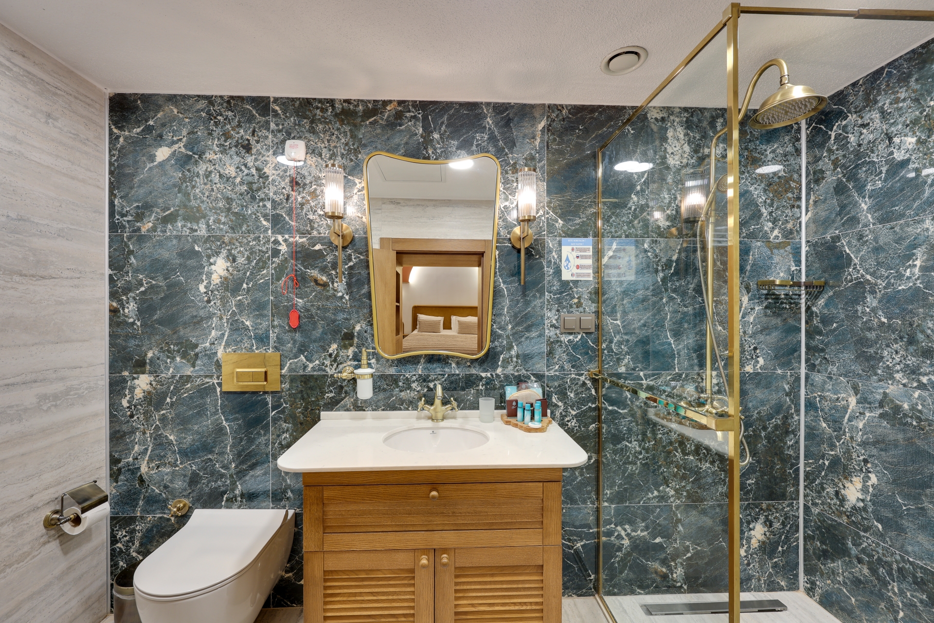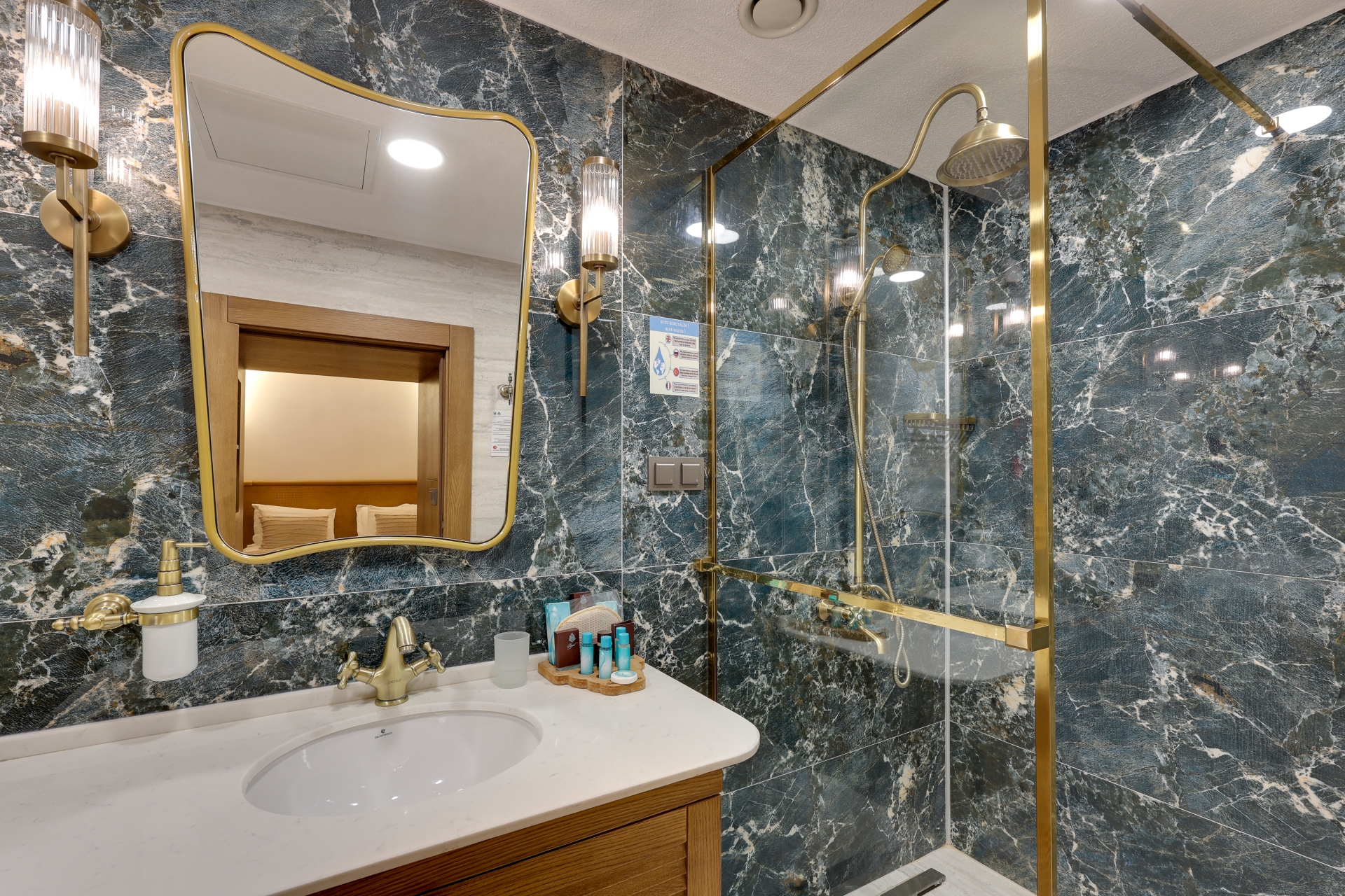 Banyo bölümünde ise tarihi mekan konseptine uygun olarak pirinç malzemeden sıhhi tesisat ve banyo armatürleri seçilmiştir. Banyoda, panjur detaylarına sahip kapılı ve çekmeceli banyo dolabı, rustik ayna ve havlu askısı bulunmaktadır. Tarihi mekan konseptine uygun olarak her türlü banyo aksesuarı kullanıcılara sunulmaktadır. (Banyo tekstili ürünleri ve banyo malzemeleri eklenecektir)
