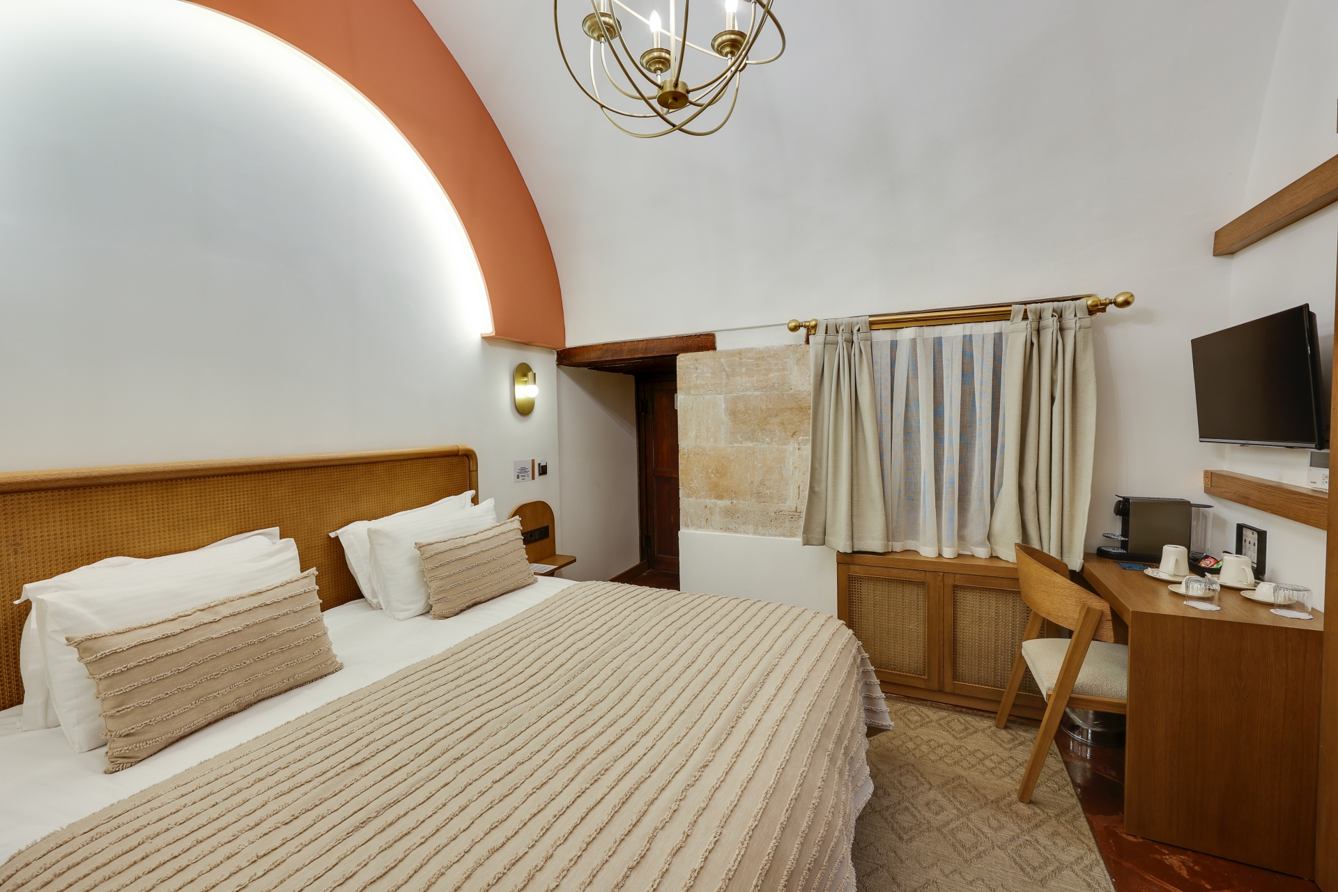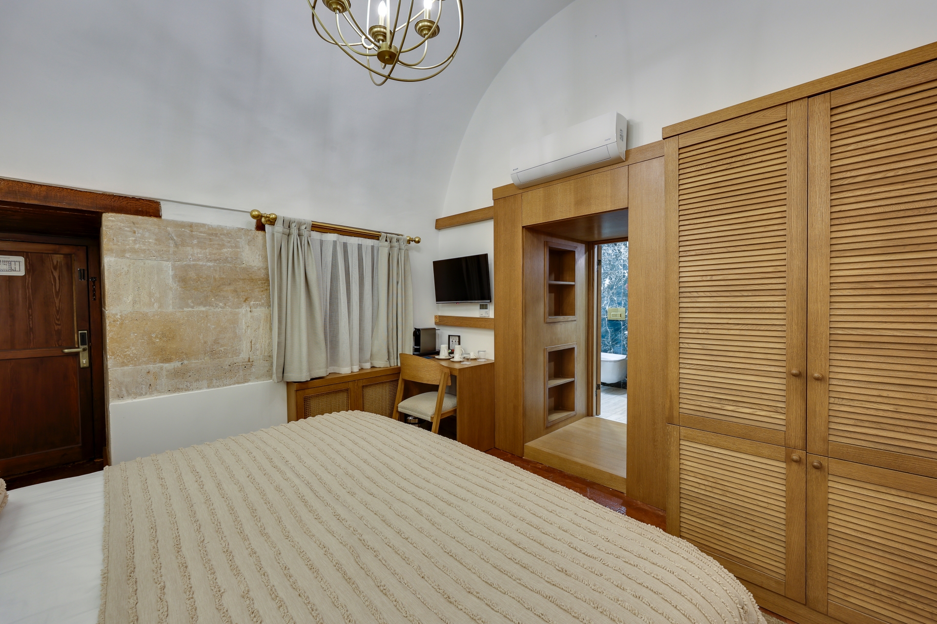 Odamız çift kişilik oda konseptindedir. 15m2’lik oda hacmine ek olarak 6.5m2’lik banyo & tuvalet hacmi bulunmaktadır. Odanın zemini orijinal haliyle korunmuş olup köşeli tuğladan yapılmıştır. Oda tavanı tonoz örtü şeklinde 365 cm yüksekliğinde ferah bir görünüm sunmaktadır. Odada çift kişilik yatak, minibar, su ısıtıcısı fonksiyonlu Nespresso kahve makinesi, emanet kasası, klima, çekyat ve bazı odalarda bavul bölmesi bulunmaktadır. Çift kişilik yatak ihtiyaca göre ayrılarak iki ayrı tek kişilik yatak olarak düzenlenebilmektedir.