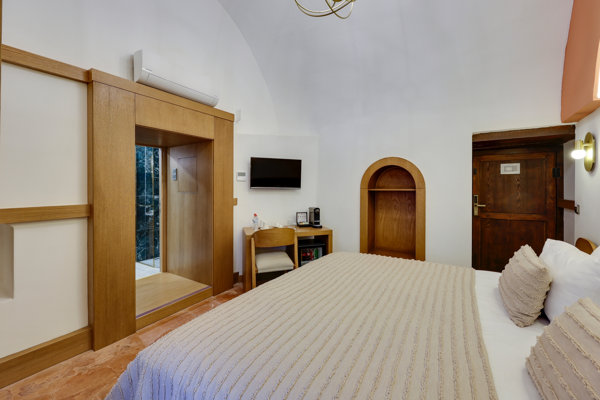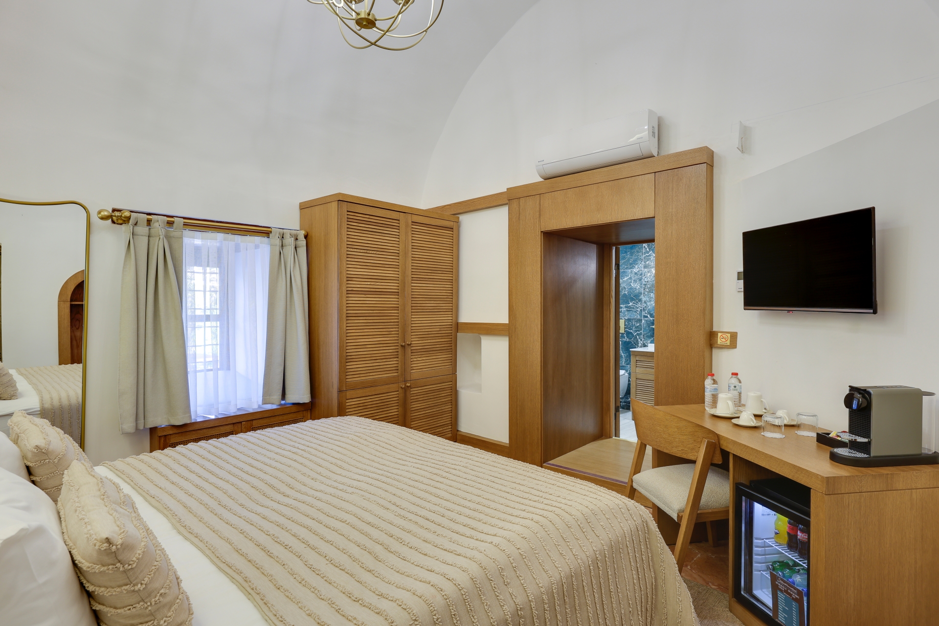 Odamız çift kişilik oda konseptindedir. 15m2’lik oda hacmine ek olarak 6.5m2’lik banyo & tuvalet hacmi bulunmaktadır. Odanın zemini orijinal haliyle korunmuş olup köşeli tuğladan yapılmıştır. Oda tavanı tonoz örtü şeklinde 365 cm yüksekliğinde ferah bir görünüm sunmaktadır. Odada çift kişilik yatak, minibar, su ısıtıcısı fonksiyonlu Nespresso kahve makinesi, emanet kasası, klima, çekyat ve bazı odalarda bavul bölmesi bulunmaktadır. Çift kişilik yatak ihtiyaca göre ayrılarak iki ayrı tek kişilik yatak olarak düzenlenebilmektedir.