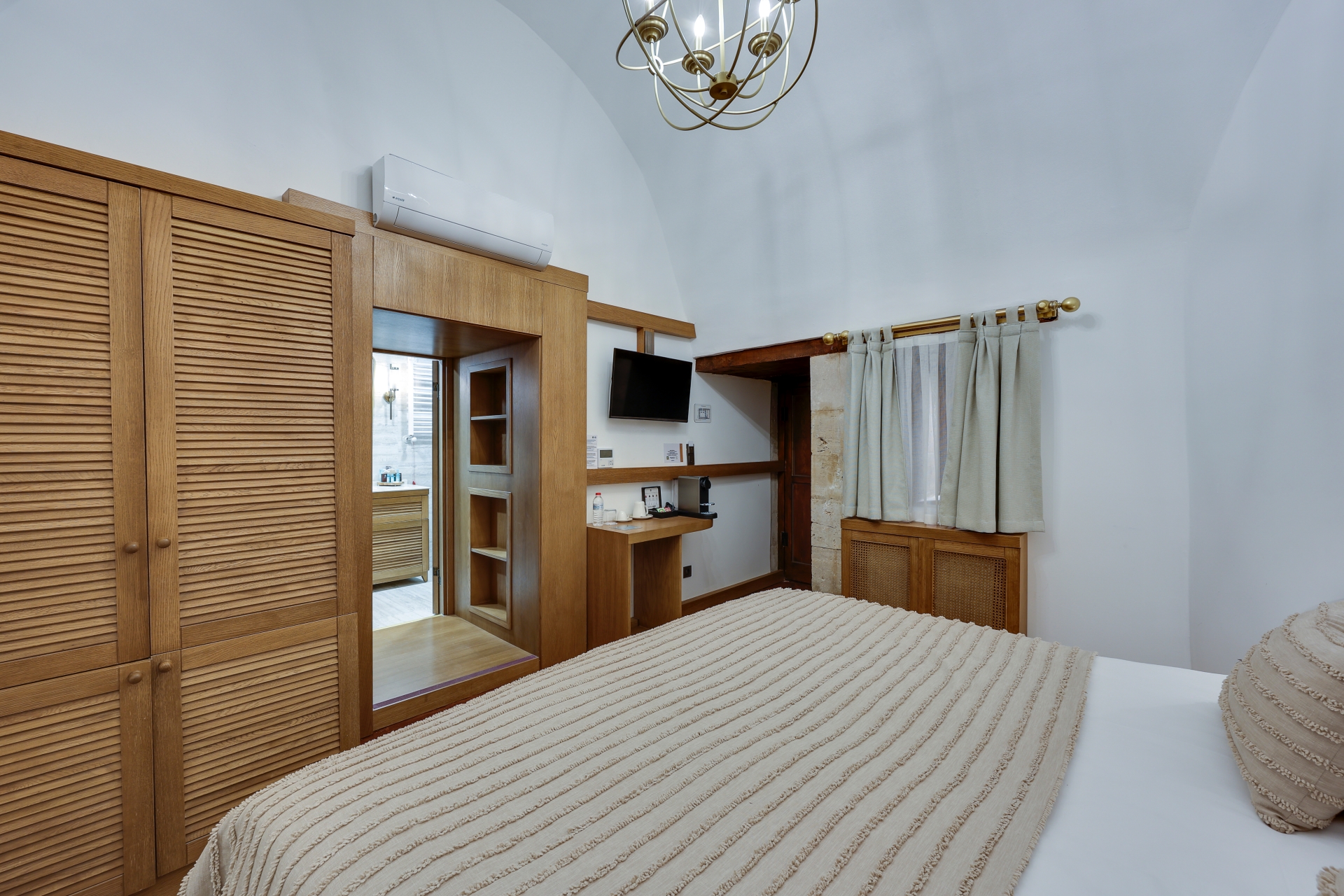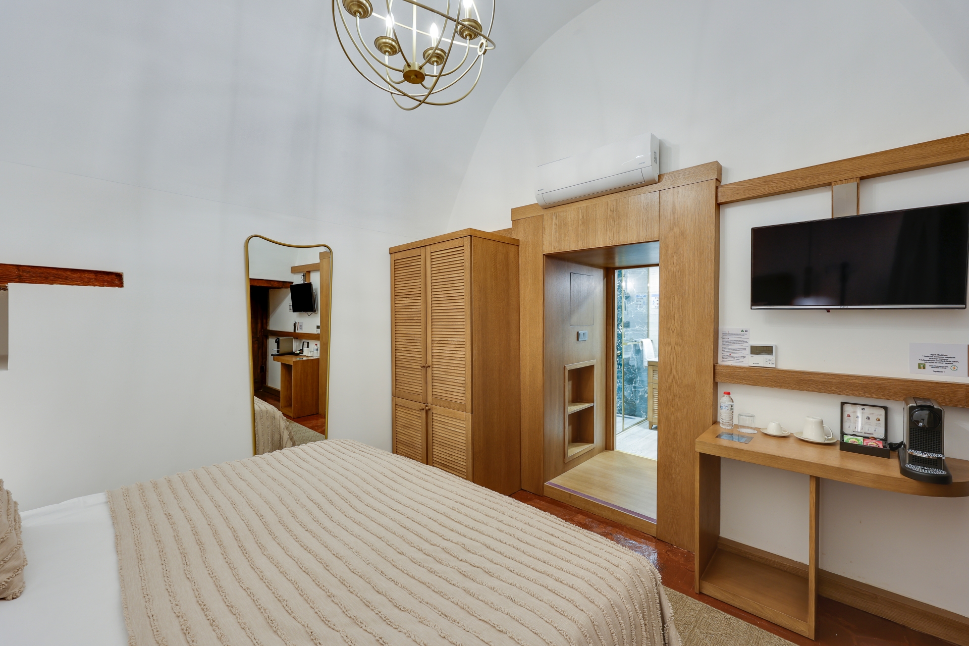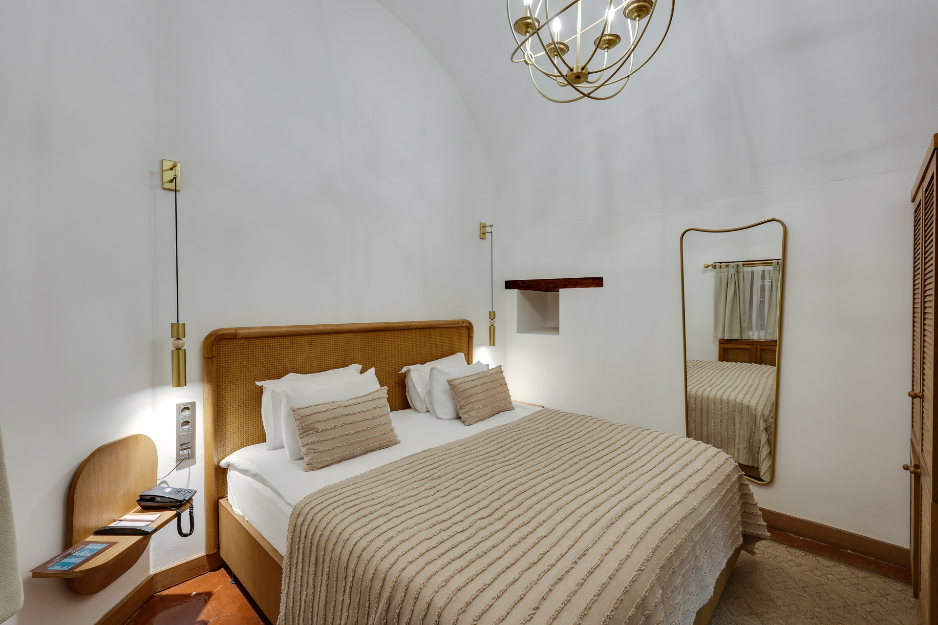 Odamız çift kişilik oda konseptindedir. 15m2’lik oda hacmine ek olarak 6.5m2’lik banyo & tuvalet hacmi bulunmaktadır. Odanın zemini orijinal haliyle korunmuş olup köşeli tuğladan yapılmıştır. Oda tavanı tonoz örtü şeklinde 365 cm yüksekliğinde ferah bir görünüm sunmaktadır. Odada çift kişilik yatak, minibar, su ısıtıcısı fonksiyonlu Nespresso kahve makinesi, emanet kasası, klima, çekyat ve bazı odalarda bavul bölmesi bulunmaktadır. Çift kişilik yatak ihtiyaca göre ayrılarak iki ayrı tek kişilik yatak olarak düzenlenebilmektedir.