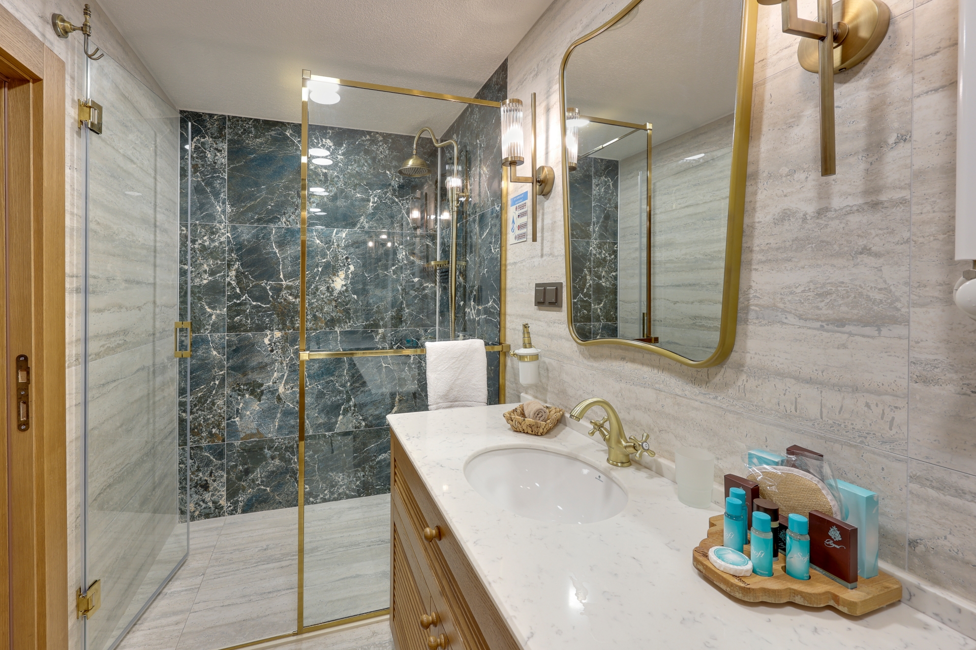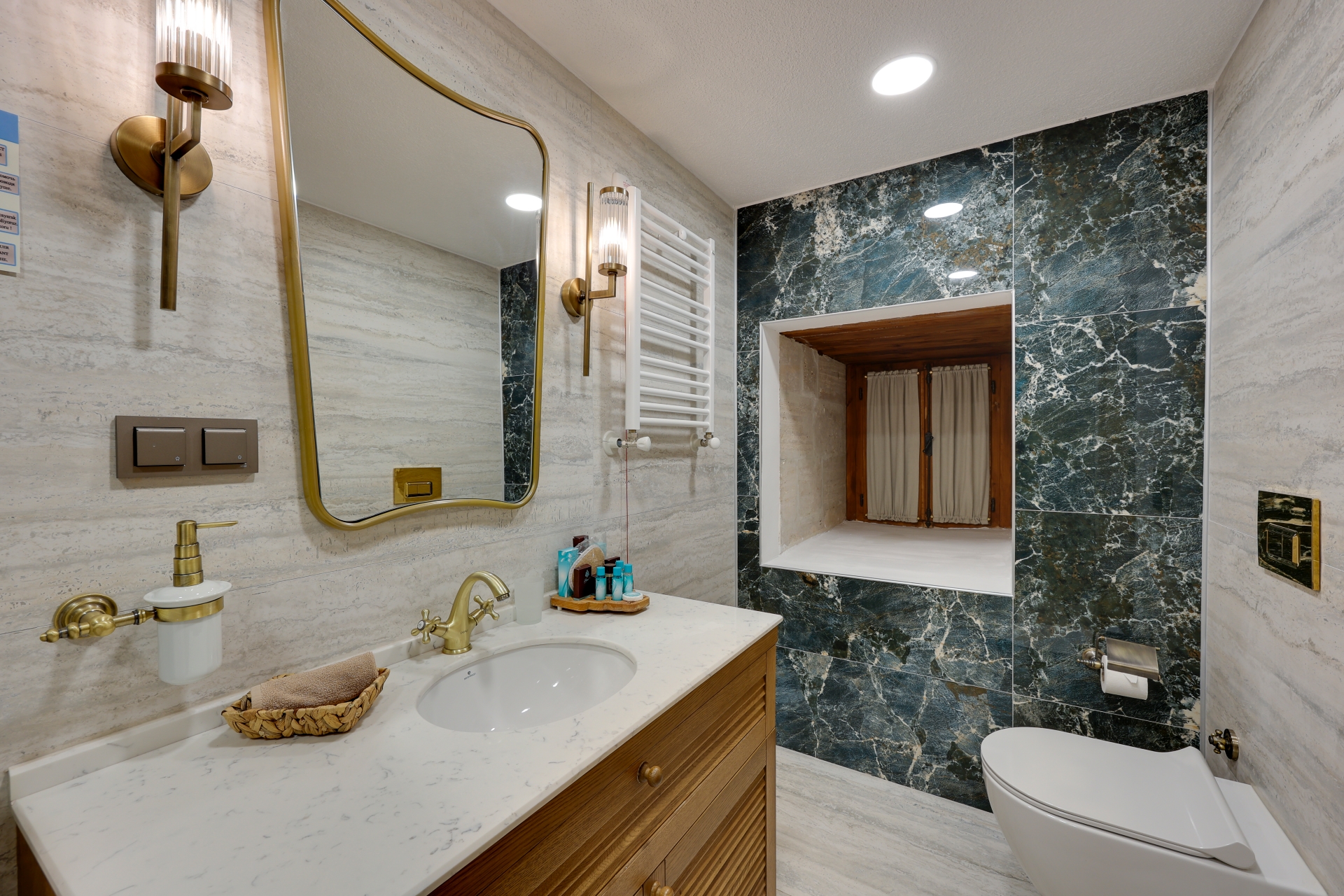 Banyo bölümünde ise tarihi mekan konseptine uygun olarak pirinç malzemeden sıhhi tesisat ve banyo armatürleri seçilmiştir. Banyoda, panjur detaylarına sahip kapılı ve çekmeceli banyo dolabı, rustik ayna ve havlu askısı bulunmaktadır. Tarihi mekan konseptine uygun olarak her türlü banyo aksesuarı kullanıcılara sunulmaktadır. (Banyo tekstili ürünleri ve banyo malzemeleri eklenecektir)