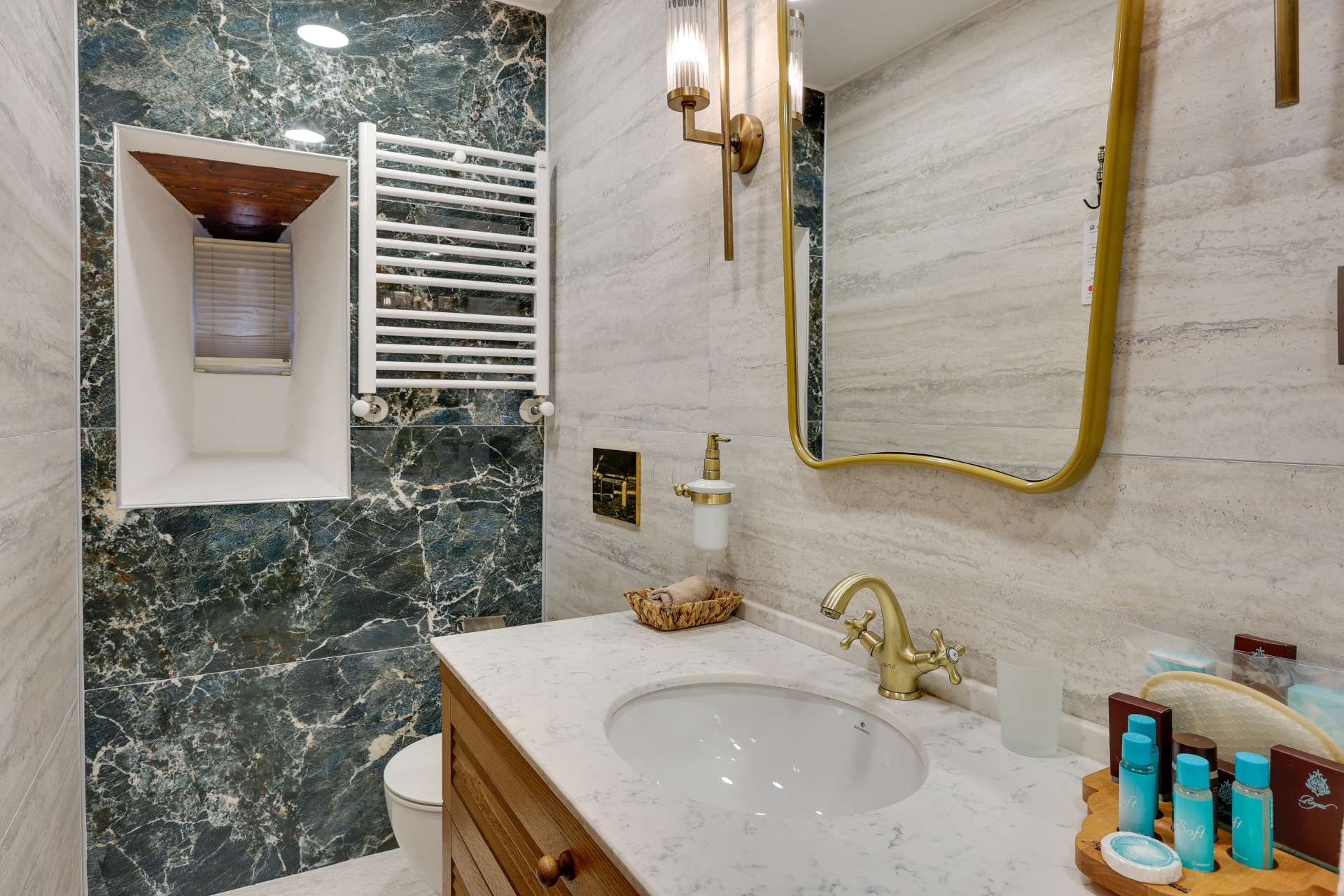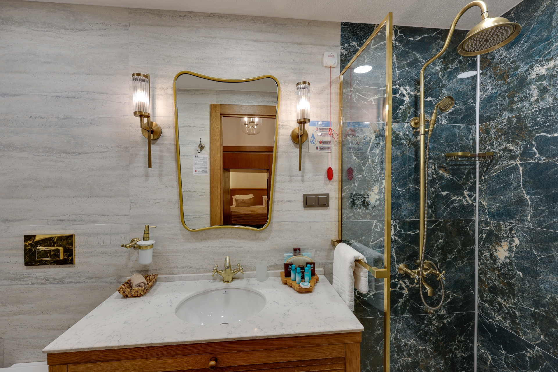 Banyo bölümünde, tarihi mekan konseptine uygun olarak antika pirinç malzemeden sıhhi tesisat ve banyo armatürleri seçilmiştir. Banyoda, kepenk detaylarına sahip kapı ve çekmeceli ahşap banyo dolabı, rustik ayna, tuvalet, duşakabin ve bazı odalarda jakuzi bulunmaktadır. Tarihi mekan konseptine uygun olarak her türlü banyo aksesuarı kullanıcılara sunulmuştur. (Banyo tekstili ürünleri ve buklet malzemeleri eklenecektir)